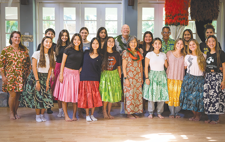 A $250,000 gift from Stephen Gainsley and Gloria Kosasa Gainsley to Mid-Pacific Institute’s Pūpūkahi endowment will support the school’s commitment to Hawaiian cultural education via hula lessons for high school students. Pictured are Pūpūkahi I Ke Alo O Nā Pua dancers with Mid-Pacific vice president of institutional advancement Shannon Cleary (left), Stephen Gainsley and Gloria Kosasa Gainsley (middle), and kumu hula Michael Lanakila Casupang (back third from right).